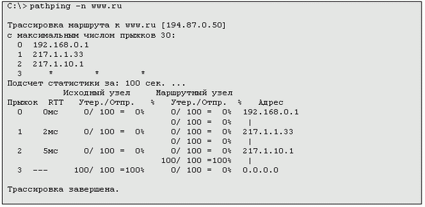 Аналогичная задача (трассировка маршрута до узла www.ru), выполненная командой pathping.