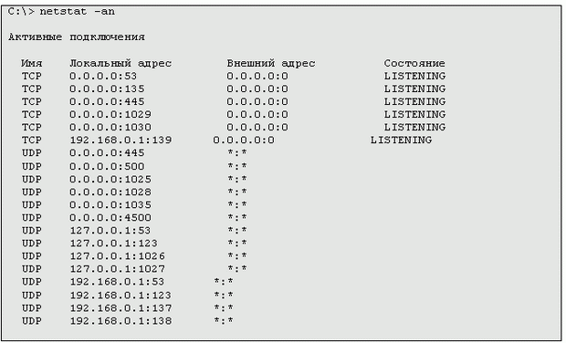 Пример 6. Команда netstat (с параметрами –an - отображение в числовой форме списка активных подключений и слушающих портов).