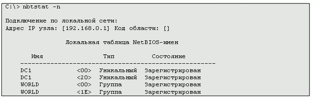 Пример 7. Команда nbtstat (с параметром –n - отображение локальных имен NetBIOS).