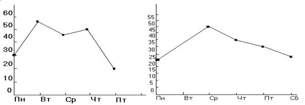Школу трудности уроков используют и для гигиенической оценки школьного расписания. С этой целью подсчитывают сумму баллов по дням недели в отдельных классах, затем нагрузку изображают графически (по оси абсцисс – дни недели, по оси ординат – нагрузка в баллах) и сравнивают её с динамикой недельной работоспособности учащихся. Школьное расписание оценивается положительно в том случае, если получается кривая с одним подъёмом в среду (2) или в четверг (при шестидневной учёбе) или с двумя (1) – во вторник и в пятницу при пятидневке. Расписание оценивается как нерациональное, если наибольшая сумма баллов приходится на начало или конец недели, а также при равномерном распределении нагрузки в недельном цикле. В последние годы осуществлён переход большого числа школ на 5-дневную неделю. Два выходных дня обеспечивают более благоприятные условия для динамики работоспособности детей, т. к. исключается один из дней с пониженной работоспособностью (суббота), более продолжительный отдых даёт также возможность активно использовать их для занятий физкультурой и спортом. Однако гигиенисты считают, что недопустимо сокращение учебной недели за счёт увеличения ежедневной нагрузки, т.е. продолжительность занятий в оставшиеся учебные дни не должна увеличиваться. Кроме того, в связи с большим периодом врабатываемости после двух выходных дней в расписании необходимо