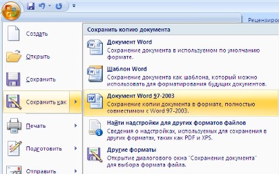 Следует обратить внимание, что Word 2007 по умолчанию сохраняет файлы в формате.docx. Этот формат не могут читать старые версии программы. Поэтому, если вы хотите, чтобы документ был совместим с предыдущими версиями Word, необходимо сохранять файл в "режиме ограниченной функциональности". Это делается с помощью меню "Сохранить как…" кнопки "Office".
