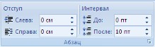 На панели "Абзац" расположены две опции форматирования абзаца: "Отступ" и "Интервал", которые регулируют свободное поле по горизонтали и вертикали соответственно.