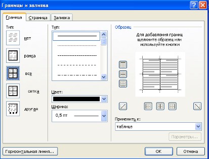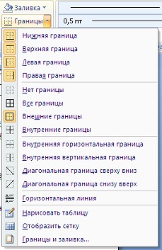 Для настроек границ таблицы служит кнопка "Границы". Из ее контекстного меню можно выбрать различные типы границ.