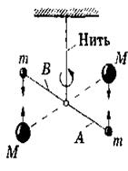 Легкое коромысло Ас двумя одинаковыми шариками массой т = 729 г подвешено на упругой нити. На коромысле Вукреплены на той же высоте массивные шары массой М — 158 кг. Поворачивая коромысло Ввокруг вертикальной оси, можно изменять расстояние между шарами с массами т и М. Под действием пары сил, приложенных к шарам т со стороны шаров М, коромысло Аповорачивается в горизонтальной плоскости, закручивая нить до тех пор, пока момент сил упругости не уравновесит момент сил тяготения. Зная упругие свойства нити, по измеренному углу поворота можно найти возникающие силы притяжения, а так как массы шаров известны, то и вычислить значение G.