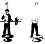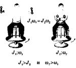 Человек, стоящий на скамье Жуковского (она с малым трением вращается вокруг вертикальной оси), держит в руках колесо, вращающееся вокруг горизонтальной оси. Начальный момент импульса Ьг = 0. Если поднять вращающееся колесо (правый рисунок), то Ьг остается равным нулю (поворот колеса осуществляется за счет внутренних сил) и скамья начнет вращаться в направлении, противоположном направлению вращения колеса с угловой скоростью со2, удовлетворяющей равенству Ьг = J1(H1 - J-^-z = 0 (Jj — момент инерции колеса; a»j — угловая скорость колеса; J2 — момент инерции системы «человек + скамья»).