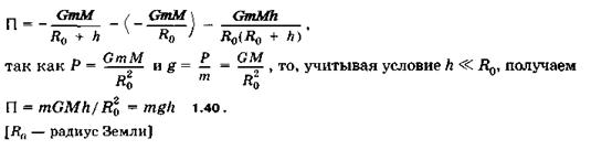 Работа, совершаемая консервативными силами, равна изменению потенциальной энергии системы, взятому со знаком минус 1.39: А= - ΔП = - (П2 – П1) = П1 - П2. Тогда, учитывая выражение для А 1.67, имеем П1 - П2 = -m (GM/R1 - GM/R2.). При R2 → ∞ потенциальная энергия П2 → 0. Первая точка выбрана произвольно, получаем записанное выражение.