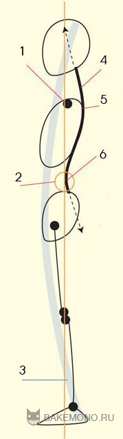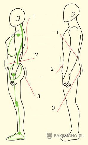 3. Тазобедренный сустав соединен с коленной голеностопной линией под небольшим углом, так что бы колени соответствовали с центром тяжести. Если посмотреть на силуэт скелетной структуры, то от головы до ног проходит дуга. Однако такая дуга наблюдается у прямо стоящих людей, а в наше время многие сутулятся.