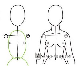 Чтобы нарисовать грудь, отметьте соски внутри контура тела, а затем добавьте объем.