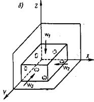 5.1.1 Схема базирования призматических деталей. Всякое твердое тело, рассматриваемое в системе трех взаимно перпендикулярных осей, может иметь шесть степеней свободы: перемещение вдоль осей ОХ, ОY и OZ (рис.5,а) и повороты относительно тех же осей. Если задать шесть координат, то можно точно определить положение детали в пространстве.