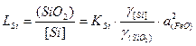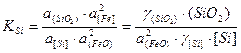 В уравнении константы равновесия реакции окисления кремния принято, что активность растворителя, то есть железа, близка к единице аFe ≈1; активности оксида кремния и кремния выражены через их коэффициенты активности и массовые доли.