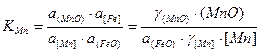 Для оксидов марганца и железа, находящихся в шлаке, за стандартное состояние вещества принято реальное состояние, для раствора выполняется закон Рауля; для марганца (примесь в расплаве железа) в качестве стандартного принято условное состояние вещества, раствор подчиняется закону Генри.