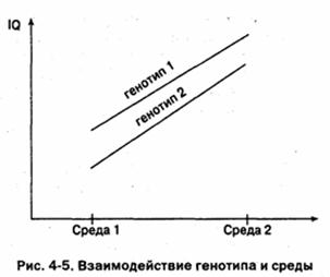 Основной вывод из результатов большинства психогенетических исследований может быть сформулирован следующим образом: в психическом развитии ведущую роль играет взаимодействие генотипа и среды. Примером такого взаимодействия может служить обучение детей с разными генетическими задатками в обычной школе (среда 1) и в гимназии с углубленным изучением предметов (среда 2). Графически эффект взаимодействия генотипов с разными средовыми условиями представлен на рис. 4-5.