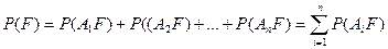Если событие F может произойти только при условии появления одного из событий (гипотез) А1,А2,…,Аn, образующих полную группу, то вер-ть соб F =сумме произведений вероятностей каждого из этих событий на соответствующие условные вер-и события F.