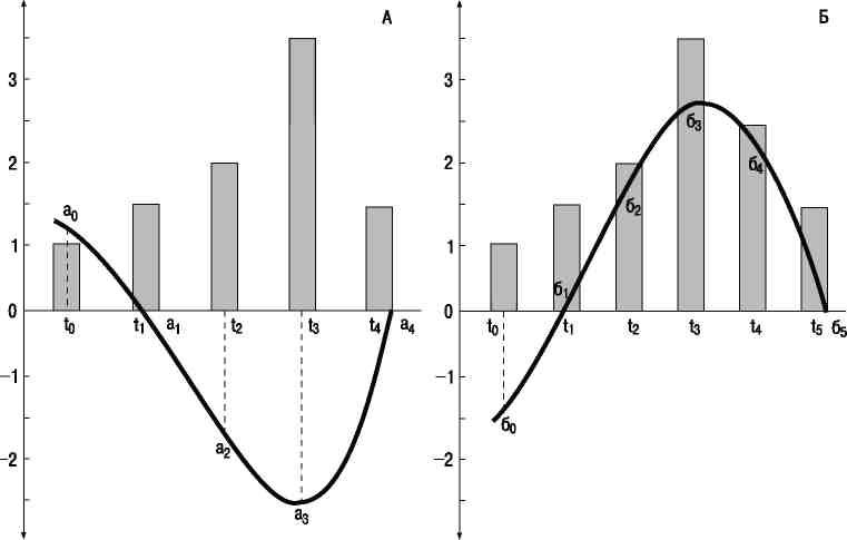 Рис. 5.6. Схема, показывающая фазность развития следовых процессов. А – изменение величины тормозных реакций после предшествования процесса возбуждения; Б – изменение величины активизирующих реакций после предшествования тормозных реакций. Столбиками обозначена величина реакций, кривые линии – изменение во времени нервных процессов (t0–t5): следовое возбуждение, а1 – исчезновение следов возбуждения, а2–а4 – торможение, развивающееся по механизму отрицательной индукции; б0 – следовое торможение, б1 – исчезновение следового торможения, б2–б5 – возбуждение, развивающееся по типу положительной индукции.