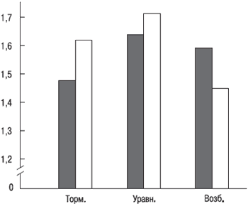 В соответствии с обнаруженной связью у уравновешенных уровень активации покоя в среднем должен быть выше, чем у неуравновешенных (поскольку уровень активации выше у «слабых»). Однако обращает на себя внимание одно обстоятельство: средний уровень активации покоя у уравновешенных ниже такого же показателя у слабых (вероятно, потому что не все уравновешенные имеют слабую нервную систему, т. е. наибольший уровень активации покоя).