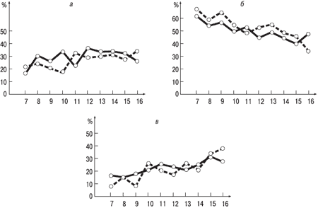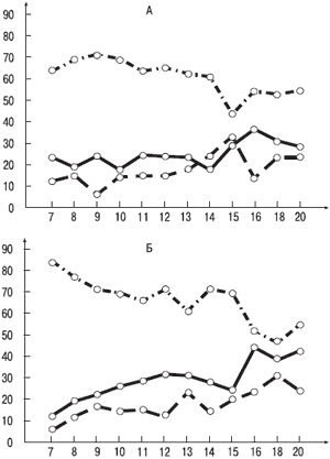Рис. 5.8. Изменение с возрастом количества лиц с различной силой нервной системы. По горизонтали – возраст, годы; по вертикали – число случаев, %. Сплошная линия – сильная нервная система, пунктирная – средняя сила, штрихпунктирная – слабая нервная система. А – данные для лиц мужского пола, Б – данные для лиц женского пола.