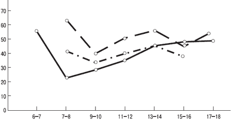 Более полная картина возрастных изменений подвижности возбуждения и торможения (по длительности реакции последействия) представлена в работах Н. Е. Высотской (1972б), А. Г. Пинчукова (1974а) и Ж. Е. Фирилевой (1974), обследовавших в общей сложности около 2500 человек. Этими авторами выявлена одна и та же закономерность: снижение подвижности возбуждения у детей в период от 6–7 лет к 8–9 годам, затем рост подвижности во время полового созревания (11—14 лет), новое, но менее выраженное снижение подвижности с 14 до 16 лет и некоторая стабилизация в возрасте 17—20 лет (см. рис. 5.9). Почти такая же динамика прослеживается и в отношении подвижности торможения.