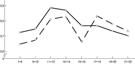 Рис. 5.10. Изменение с возрастом подвижности возбуждения у лиц мужского и женского пола (Н. Е. Высотская, 1972). По горизонтали – возраст, годы; по вертикали – степень подвижности (в условных единицах). Сплошная линия – данные лиц мужского пола, пунктирная – данные лиц женского пола.