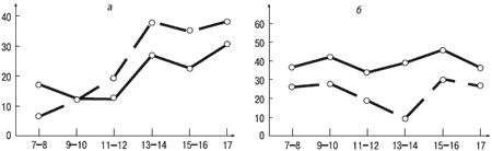 Рис. 5.12. Изменение с возрастом «внутреннего» баланса (А. Г. Пинчуков, 1974). По горизонтали – возраст, годы; по вертикали – число случаев, %. Сплошная линия – данные лиц мужского пола, пунктирная – данные лиц женского пола. а – преобладание возбуждения.