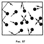 Молекулы газа беспорядочно движутся. При своем движении они сталкиваются друг с другом, а также со стенками сосуда, в котором находится газ (рис. 87). Газ состоит из огромного количества молекул, поэтому и число их ударов очень велико. Например, в комнате, в которой вы сейчас находитесь, на каждый квадратный сантиметр за 1 с молекулами воздуха наносится столько ударов, что их количество выражается двадцатитрехзначным числом. Хотя сила удара отдельной молекулы мала, но действие всех молекул о стенки сосуда приводит к значительному давлению.