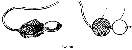 Изменение давления газа при изменении его объема учитывают, например, в таком устройстве, как резиновая груша (рис. 90). Этот прибор состоит из двух резиновых шаров с клапанами и резиновой трубки, которую обычно присоединяют к пульвериза- тору (устройству, предназначенному для распыления жидкостей). Когда шар 1 сдавливают рукой, один (впускной) клапан закрывается, и воздух из шара 1 накачивается в шар 2. При освобождении шара 1 от надавливания он благодаря упругости свонх стенок принимает первоначальную форму. При этом давление внутри его уменьшается, и очередная порция наружного воздуха, открывая впускной клапан, вновь входит внутрь шара 1. Воздух в шаре 2 в это время закрывает другой клапан и по трубке направляется в пульверизатор.