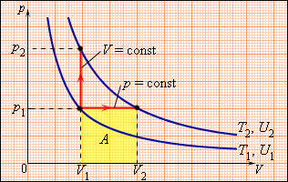 | Рисунок 3.10.1. Два возможных процесса нагревания газа на ΔT = T2 – T1. При p = const газ совершает работу A = p1(V2 – V1). Поэтому Cp > CV |