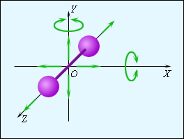 На рис. 3.10.2 изображена модель двухатомной молекулы. Молекула может совершать пять независимых движений: три поступательных движения вдоль осей X, Y, Z и два вращения относительно осей X и Y. Опыт показывает, что вращение относительно оси Z, на которой лежат центры обоих атомов, может быть возбуждено только при очень высоких температурах. При обычных температурах вращение около оси Z не происходит, так же как не вращается одноатомная молекула. Каждое независимое движение называется степенью свободы. Таким образом, одноатомная молекула имеет 3 поступательные степени свободы, «жесткая» двухатомная молекула имеет 5 степеней (3 поступательные и 2 вращательные), а многоатомная молекула – 6 степеней свободы (3 поступательные и 3 вращательные).