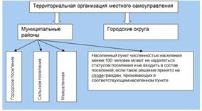 Территориальная организация — один из ключевых и сложных вопросов формирования системы местного самоуправления в России, связанный с выбором оптимальных размеров территории на которой должно осуществляться местное самоуправление. В Конституции РФ (ст. 131) закреплено, что местное самоуправление осуществляется в границах городских и сельских поселений, а также на иных территориях. Это означает, что преимущество отдается городским и сельским поселениям – городам, селам, деревням, поселкам то есть территориям, которые образовывались естественным путем, на которых люди селились и жили.