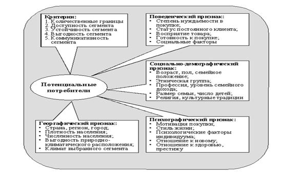 Сегментация потребителей – это обоснование (выделение) части рынка, в котором покупатели одинаково реагируют на потребительские свойства предлагаемых товаров, услуг. Данный процесс разделения общей совокупности потребителей на однородные целевые группы позволяет максимально учесть запросы покупателей и выгодно сфокусировать маркетинговые усилия. На практике многогранный процесс сегментации осуществляется с учетом ряда критериев и признаков, проиллюстрированных на рисунке 1.