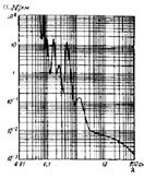 Рис. 4.7. Зависимость коэффициента затухания в воздухе от длины волны | Резонансные линии всех газов атмосферы за исключением кислорода и водяного пара расположены вне диапазона радиоволн, поэтому существенно влияет на дальность действия РТС только поглощение молекулами кислорода и водяного пара. Поглощение молекулами водяного пара максимально на волне и , а молекулами кислорода – волнах и . Коэффициент затухания радиоволн в реальной атмосфере равен сумме коэффициентов затухания в гидрометеорах и на молекулярном уровне. На рис. 4 показана зависимость коэффициента затухания в воздухе у поверхности Земли от длины волны [8]. Ясно виден резонансный характер поглощения. Кроме того, из рис. 4 следует, что на волнах длиннее молекулярным поглощением радиоволн можно пренебречь. |