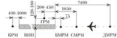 Расположение маяков относительно взлетно-посадочной полосы (ВПП) представлено на рис.1. Здесь КРМ – курсовой радиомаяк, ГРМ – глиссадный радиомаяк, МРМ – маркерный радиомаяк: БМРМ – ближний, СМРМ – средний, ДМРМ – дальний.