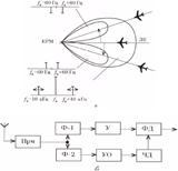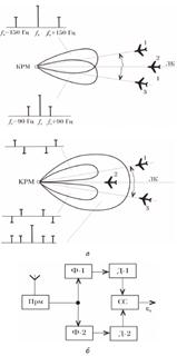 а – диаграммы направленности центрального и боковых излучателей и спектры излучаемых сигналов; б - структурная схема бортового приемника.