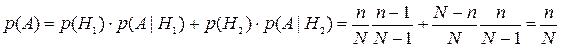 Решение. Обозначим событие Н1 = {первый шар белый}; вероятность этого события Р(Н1) = n/N. Событие Н2 = {первый шар черный}; вероятность события Р(Н2) = (N-n)/N; событие A = {второй шар белый}.