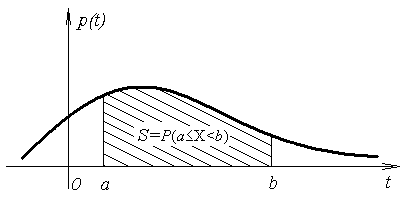 Геометрически вероятность попадания значений непрерывной случайной величины в интервал (a, b) может быть рассмотрена как площадь фигуры, ограниченной осью Ох, графиком плотности распределения p (t) и прямыми х = a и х = b (рис. 6.8).