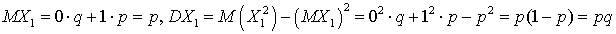 на самом деле представляет собой закон распределения.Для вычисления математического ожидания и дисперсии количества удач в n испытаниях рассмотрим для начала вспомогательную случайную величину X1 — количество удач в одном испытании. Случайная величина X1 может принимать два значения 0 и 1 с вероятностями q и p, соответственно (это закон распределения случайной величины X1). Легко вычислить, что: