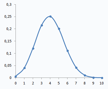 от k представлена на рисунке ниже. Для построения графика было взято n = 10, p = 0,4.