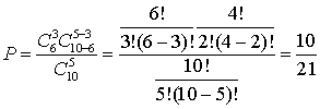 . Пример 30.2В ящике 6 синих и 4 красных шара. Вытаскиваем 5 шаров. Найти вероятность того, что среди них окажется 3 синих.По формуле гипергеометрического распределения имеем: