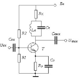 Здесь Свх и Свых – обычные разделительные конденсаторы, R1 и R2 – резисторы базовой цепи, Rэ и Сэ – элементы обратной связи по постоянному току (для термостабилизации), Rк – сопротивление коллектора и Lконт и Сконт – элементы резонансного контура.