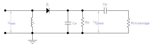 На вход детектора поступает модулированный сигнал высокой частоты. Продетектированный сигнал выделяется при нагрузке Rн, Сн, затем через Ср поступает на вход следующего каскада Rсл.