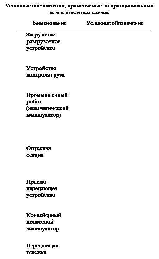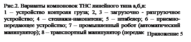 1, 2 – загрузочно-разгрузочное устройство; 3 – устройство для контроля габаритов груза; 4 – стеллажи;; 5 – кран-штабелер; 6 – подвесной грузонесущий конвейер; 7 – промышленный робот; 8 – приемно-передающее устройство с опускным столом; 9 – приемно-передающее устройство; 10 – монорельсовая дорога; 11 – опускная секция;