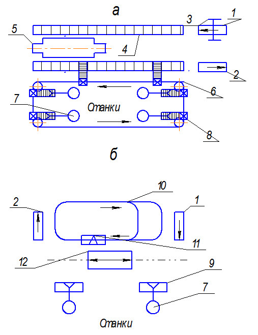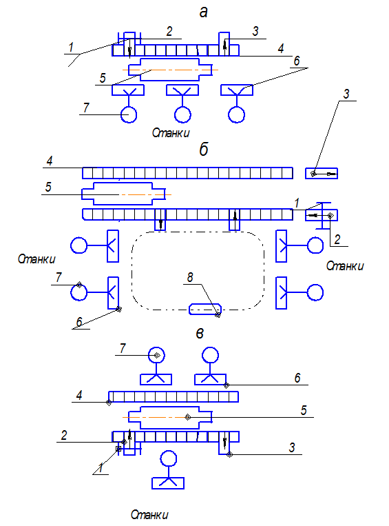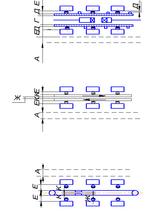 | | | Рис.1. Транспортные системы: а – автоматизированная напольная транспортно-складская система; б – стационарный конвейер; в – подвесной конвейер, при нормах расстояний А = 1,4; Д = 0,4; Е = 1,07; Г = 0,9: Ж ≥ 0,3; К зависит от размера изготовляемых деталей.