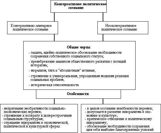 Различные течения консерватизма объединяет одна общая функция — идейно-политическое оправдание и стабилизация исторически изживших себя общественных структур. Все виды этого политического сознания отображают особенности политического мышления тех социальных слоев, положению которых в обществе угрожают новые тенденции общественного развития и которые испытывают страх перед социальным прогрессом. На Западе известны следующие типы консервативного сознания: традиционалистское, либертаристское (от фр. liberte — свобода), неоконсервативное. В России правомерно выделить консервативно-элитарный и неоконсервативный виды.