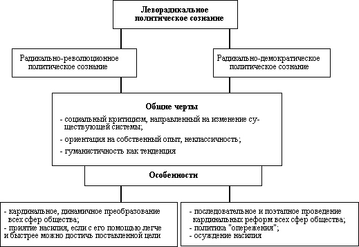 Радикализм как тип политического сознания характеризуется смысловой неопределенностью, правым и левым пределом политического спектра конкретного общества. Радикализм определяется как социальный критицизм, при этом критика существующей политической системы предполагает ее изменение. Позитивной чертой радикализма является его способность к формированию новых отношений и политических институтов. Левый радикализм на Западе характеризуется ярко выраженной антикапиталистической ориентацией. Из разновидностей левого радикализма можно выделить: социал-демократическое, социалистическое, коммунистическое и анархическое сознание. Все элементы этих типов леворадикального сознания присутствуют и в современной России.