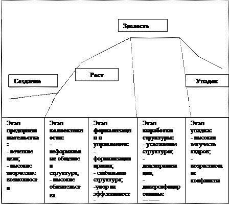 Жизненный цикл – это период, в течение которого организация проходит такие стадии своего функционирования, как создание, рост, зрелость и упадок (Б.З. Мильнер). Это предсказуемые изменения состояния организации, которые протекают во времени с определенной последовательностью. Графически один из вариантов основных этапов жизненного цикла организации представлен на рис. 12. По восходящей линии показаны создание, рост и зрелость организации, по ниспадающей кривой – спад.