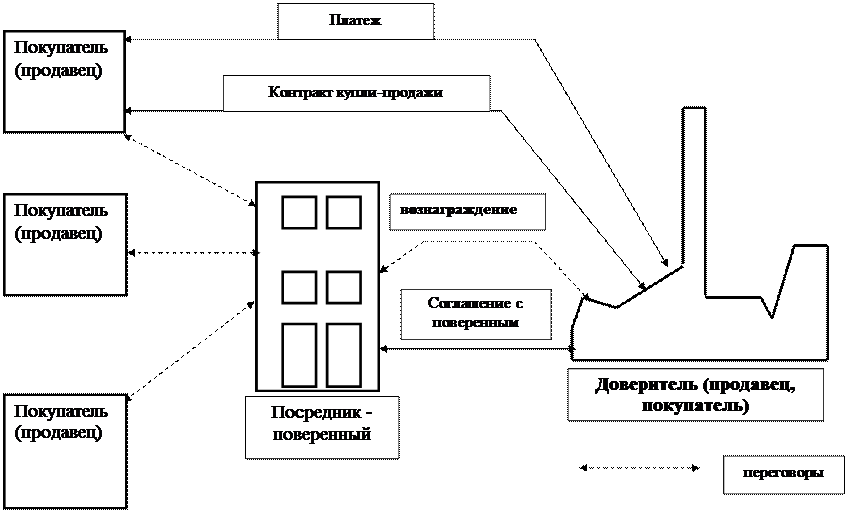 | Положение посредника-поверенного | По поручению доверителя содействует совершению коммерческих сделок, в том числе по сбыту или приобретению товаров, путем заключения сделок от имени и за счет доверителя | |