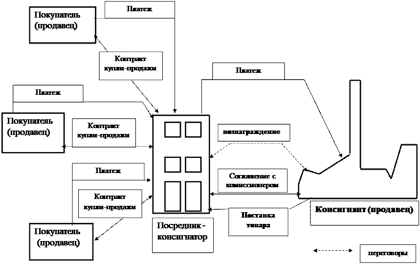 | Положение посредника-консигнатора | Консигнация только на сбыт товара, довольно крупных партий на длительное время, с перечислением выручки после продажи в установленное время консигнанту | |