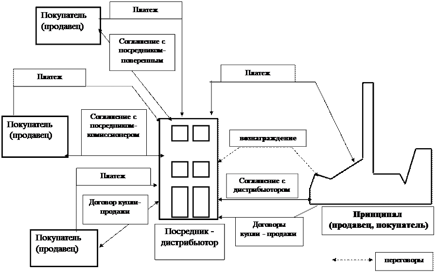 Все перечисленные варианты посредников не вкладывают свои финансовые средства в товары, а работают за вознаграждение - процент от реализованного товара, или от суммы реализации - активные поставщики новых заказов. Варианты организации деятельности посредников представлены на рис. 1 - 5.