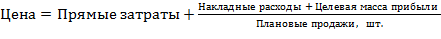 Например, прямые затраты на изготовление единицы товара составляют 1000 руб., а, кроме того, в расчете на год на него отнесено 150 000 руб. накладных расходов компании. Наконец, желаемая топ-менеджерами фирмы масса прибыли от продаж этого товара определена в 300 000 руб. при годовом плане выпуска в 10 000 шт. Тогда цена этого товара должна будет определена на уровне: