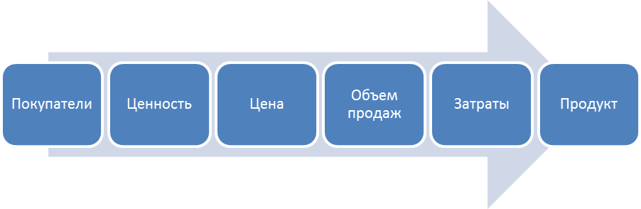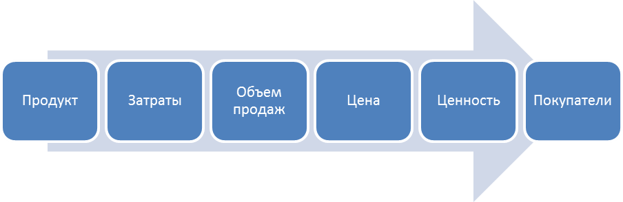 Сначала продукт разрабатывается конструкторами и технологами в соответствии с их представлениями о том, каким должен быть этот продукт. Следом производственники определяют возможный объем выпуска. Затем бухгалтерами и финансистами обсчитываются соответствующие затраты и определяется исходный уровень цены. Только после этого подключаются маркетологи, которые изыскивают разнообразные способы продвижения продукта на рынке и убеждения покупателей в обоснованности его цены. Если цена все же представляется покупателям завышенной, то используется обширный инструментарий ценовых скидок.