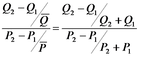 В случае значительного изменения цены и объема спроса мы имеем дело с эластичностью на дуге. Дуговая эластичность определяется как средняя эластичность, или эластичность в середине хорды, соединяющей точки линии спроса до и после изменения, т.е.